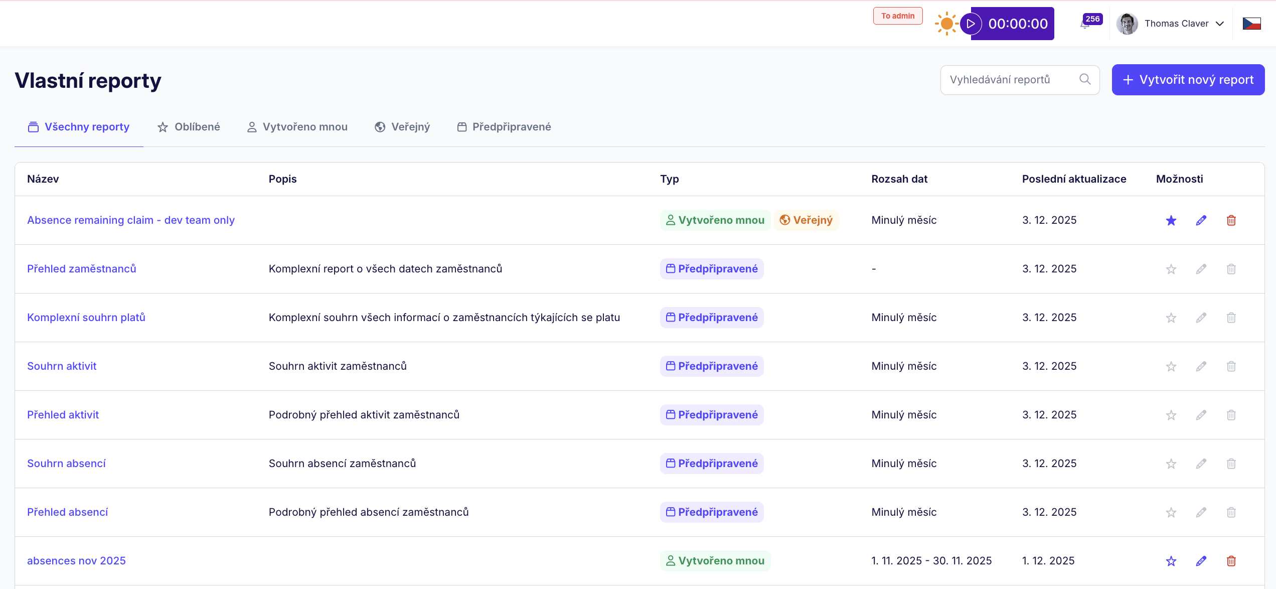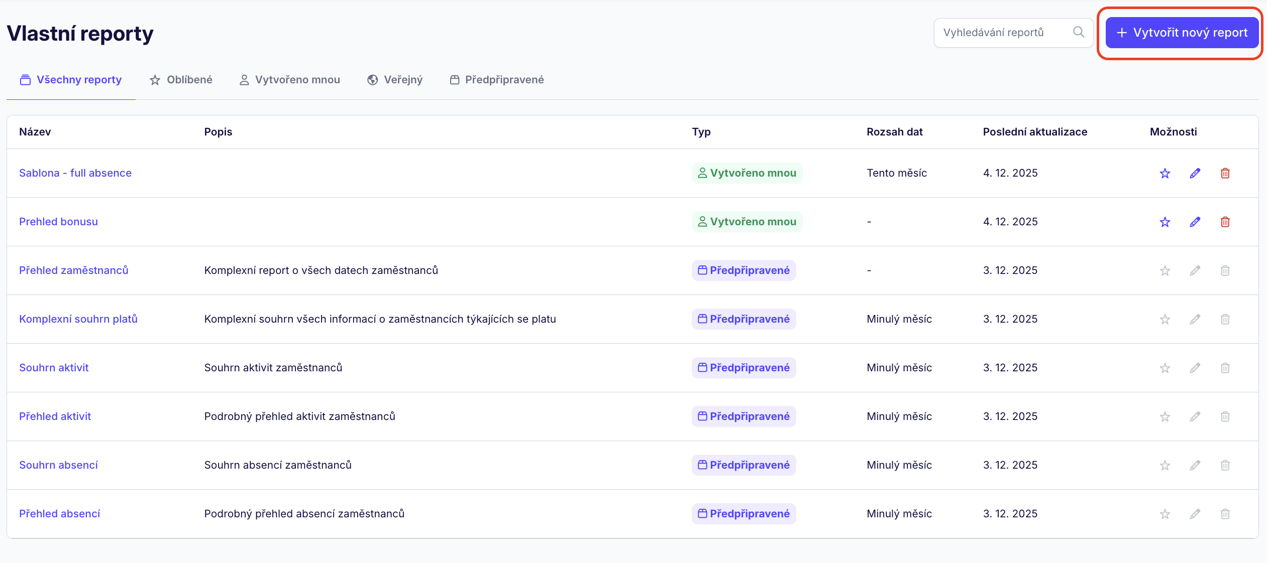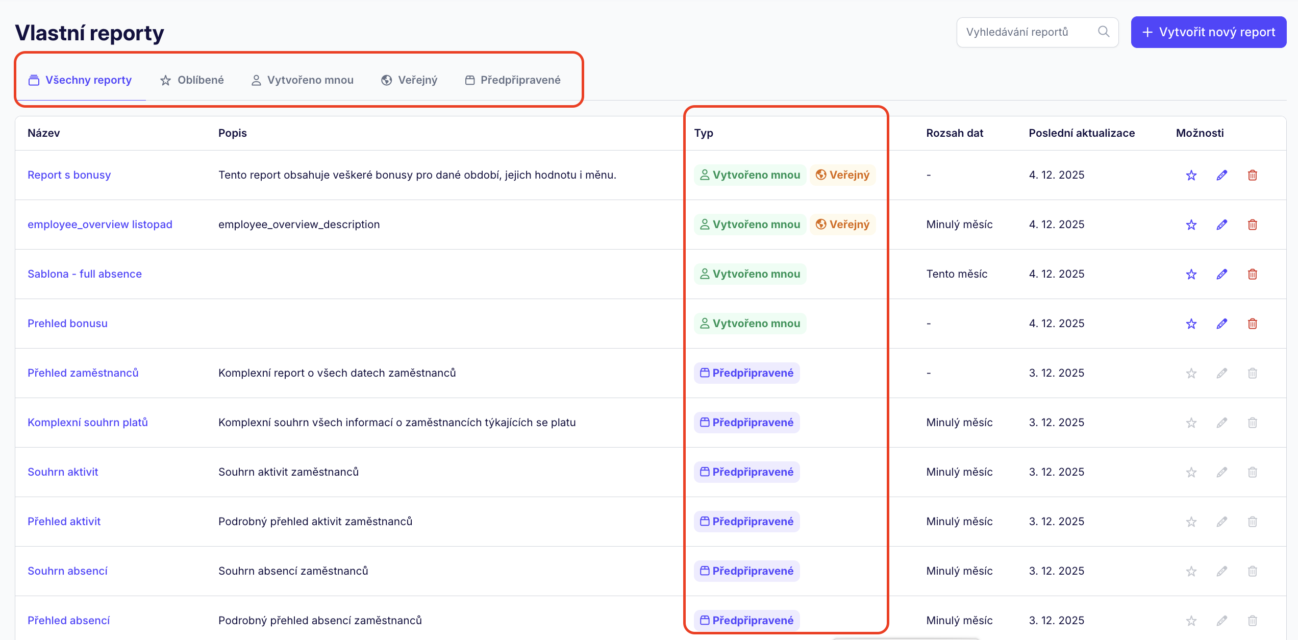 U všech reportů uvidíte, zda jsou sdílené nebo pouze vaše, případně si je můžete uložit do oblíbených. Každý typ reportů pak spadá do své kategorie, mezi kterými lze přepínat.