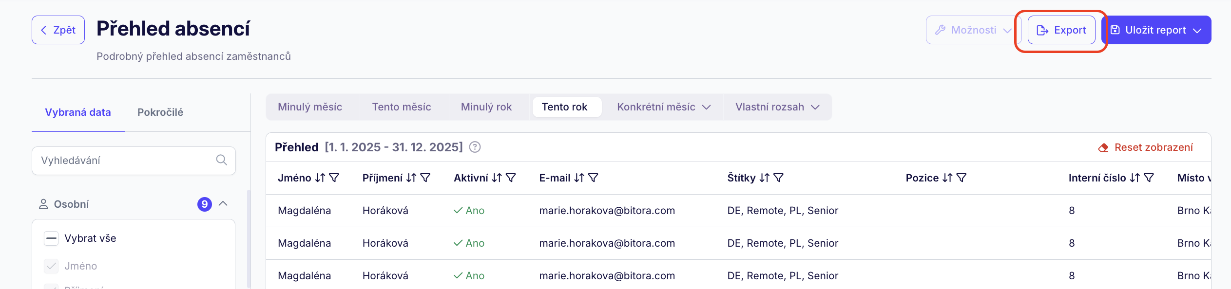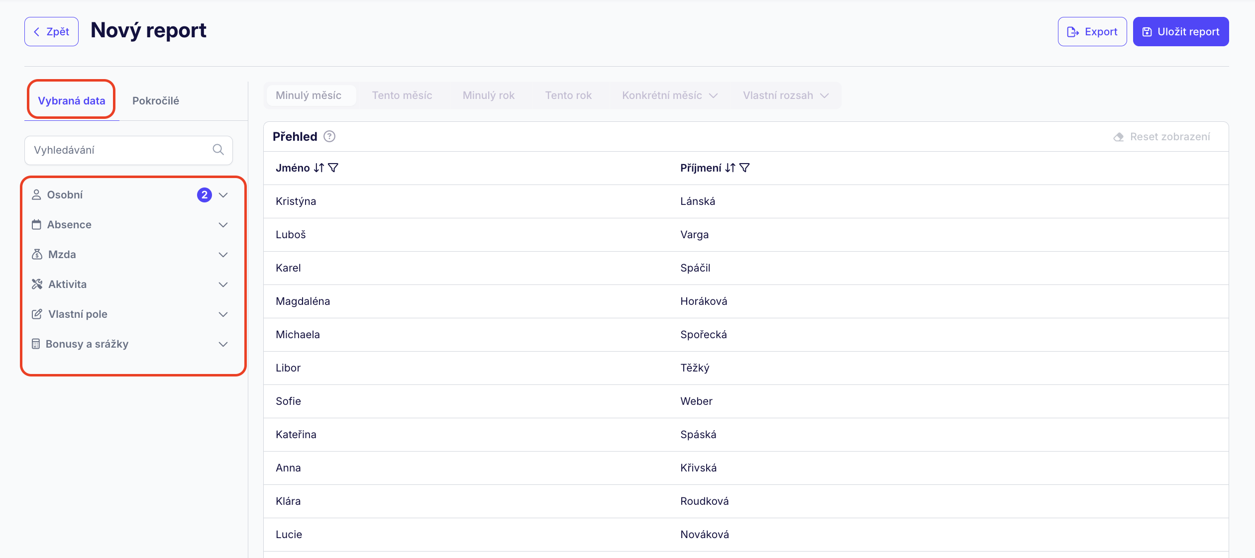 Vybraná data jsou uskupená do několik obecných kategorií, jako např. osobní údaje o uživatelích, vlastní pole, absence, mzda atd. a každou z nich stačí rozbalit a v ní selektovat data do reportu.