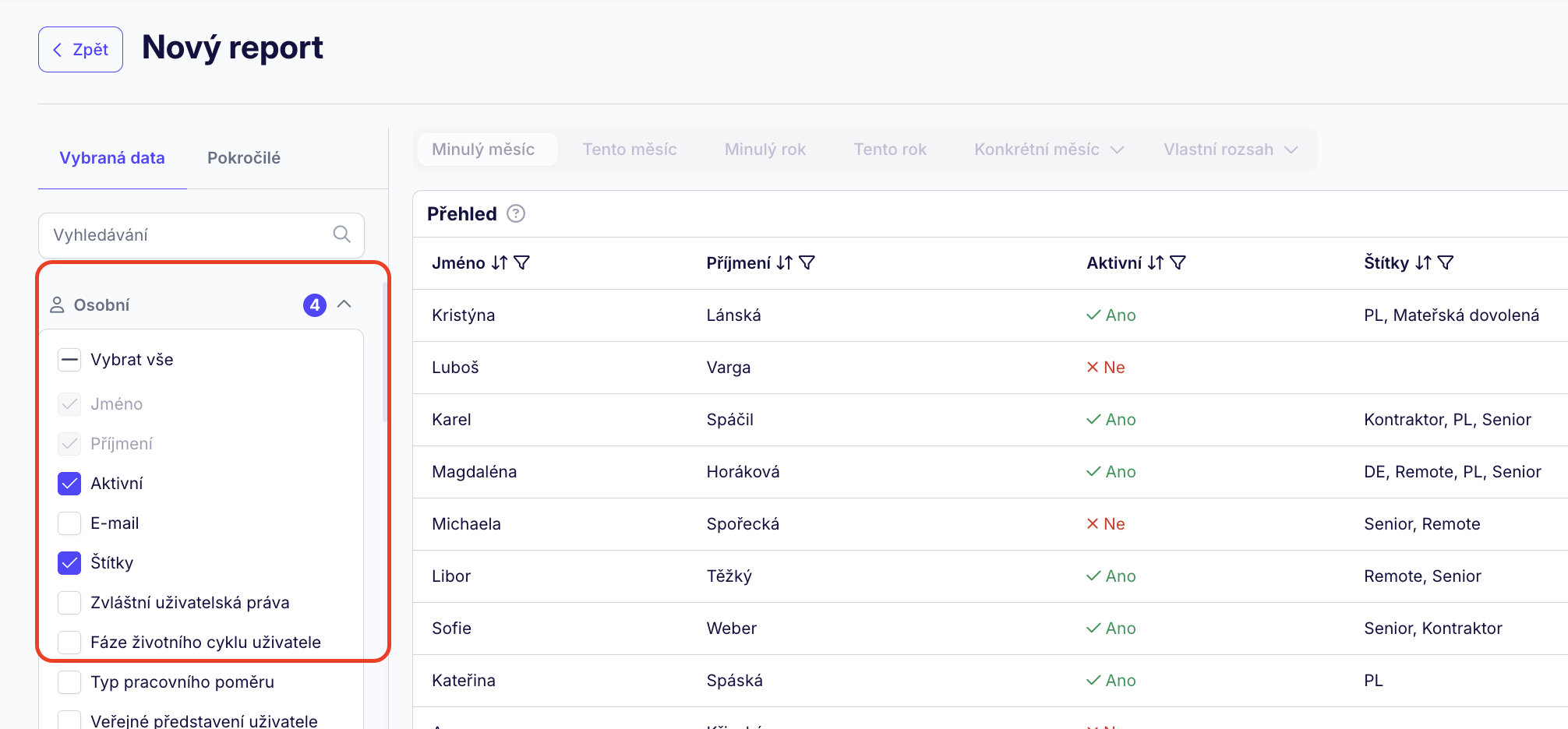 Report vždy začneme se základními informacemi jako je jméno a příjmení uživatelů. Na tomto základě můžeme stavět a přidat jakékoli další informace chceme mít v reportu zahrnuty. Nejprve se podívejme na sekci 'Vybraná data'. Odtud si data budeme do reportu volit.