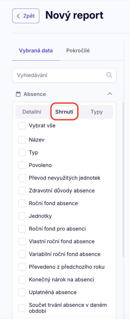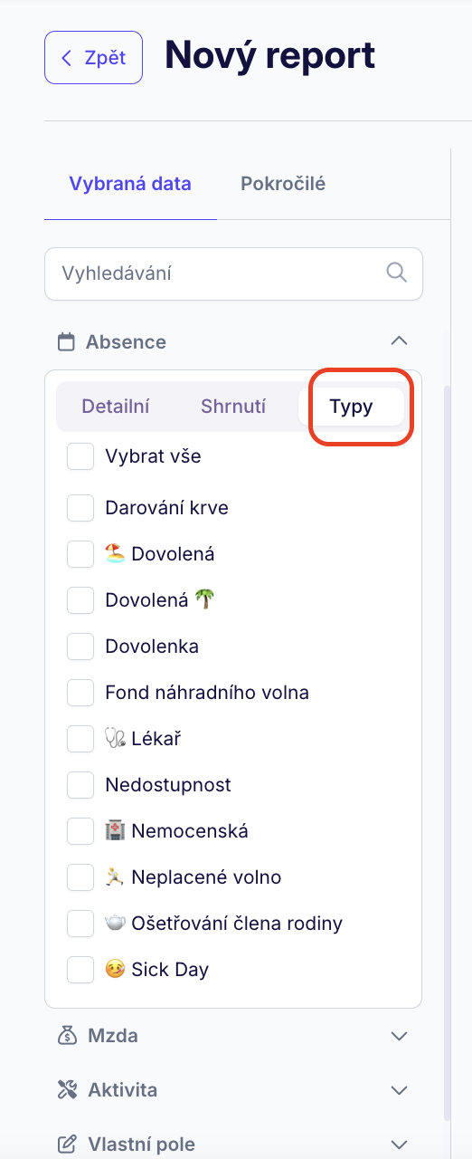 U kategorií jako Absence, Aktivity nebo zkrátka u událostních typů dat pak máme na výběr ze tří sekcí. Detailní nabízí opravdu všechna detailní data ohledně absencí (název, jejich začátek, konec atd.). Shrnutí vám nabízí součty absencí za dané období, zbývající nároky nebo třeba fondy. A v poslední sekci 'Typy' si můžete zvolit konkrétní typ absence a zjistit tak součet za určité období.