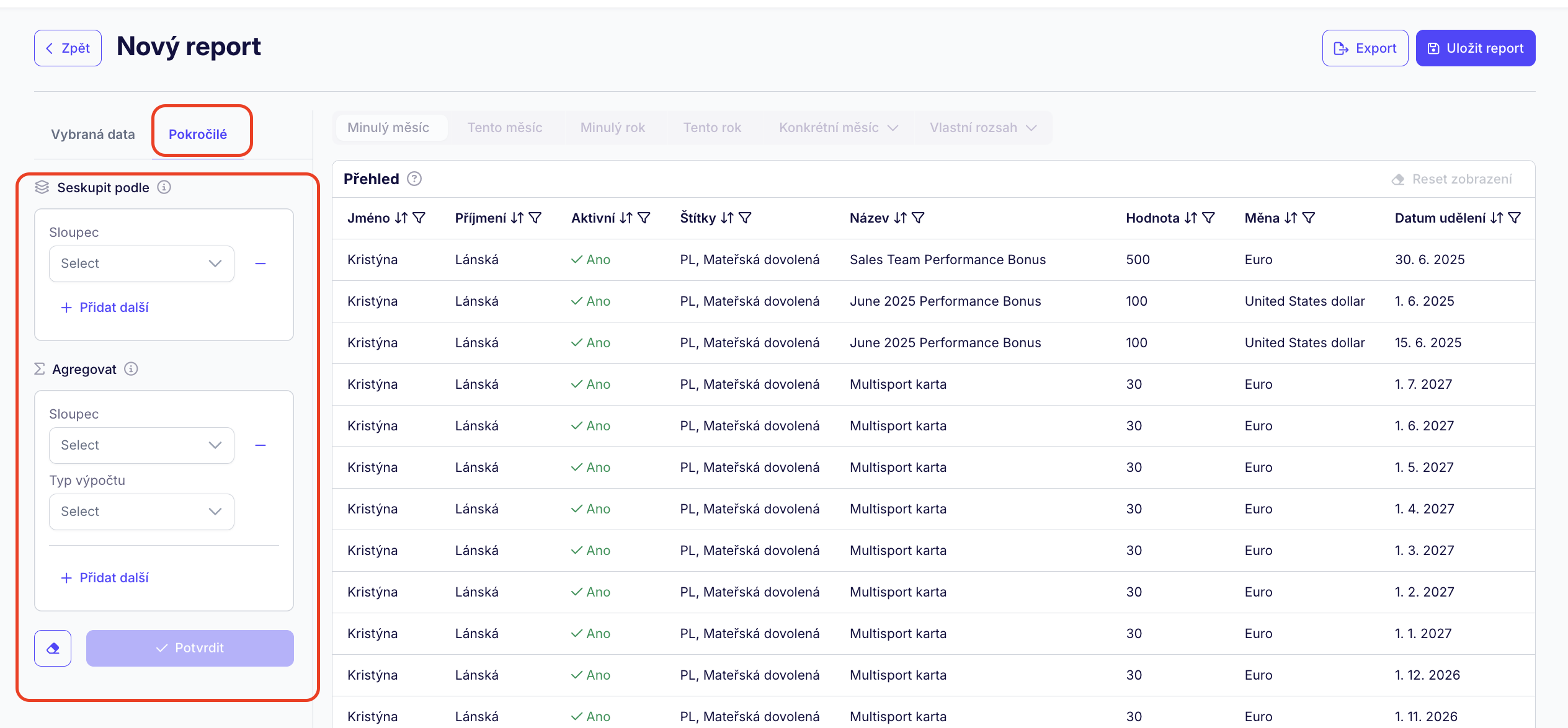 Příklad: Dejme tomu, že chceme za minulý měsíc vidět součet bonusů pro každého uživatele. Seskupíme si tedy jejich jméno do jednoho řádku a v rámci agregace vybereme hodnotu bonusů a jako typ výpočtu zvolíme SUM.