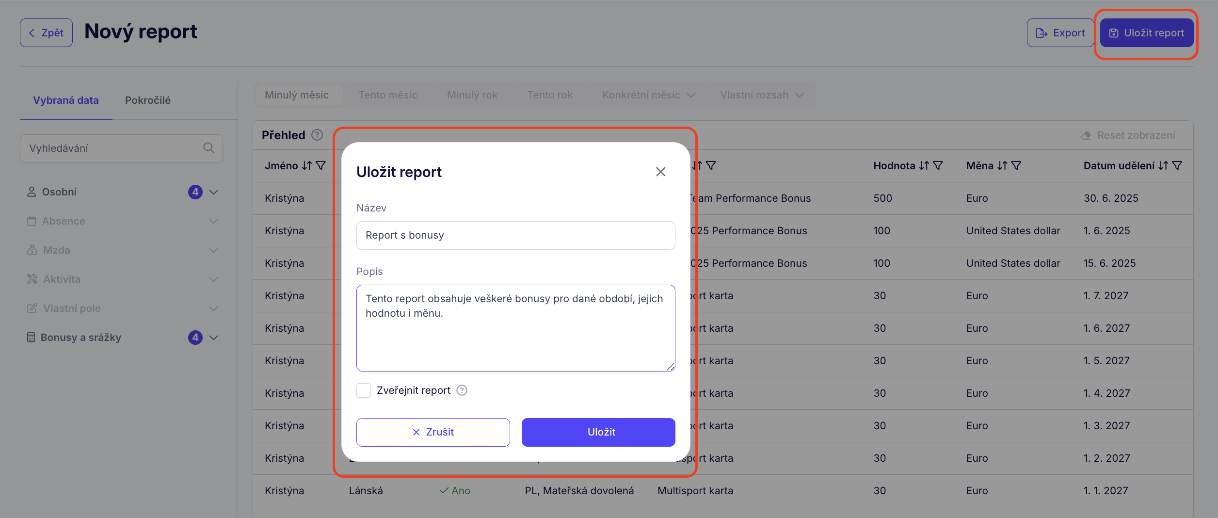 Ve chvíli, kdy máme report nastavený a jsme s ním spokojeni, pojďme si jej uložit. V pravém horním rohu klikneme na 'Uložit report'. Ten si nějak pojmenujeme a můžeme mu přidat i relevantní popis.