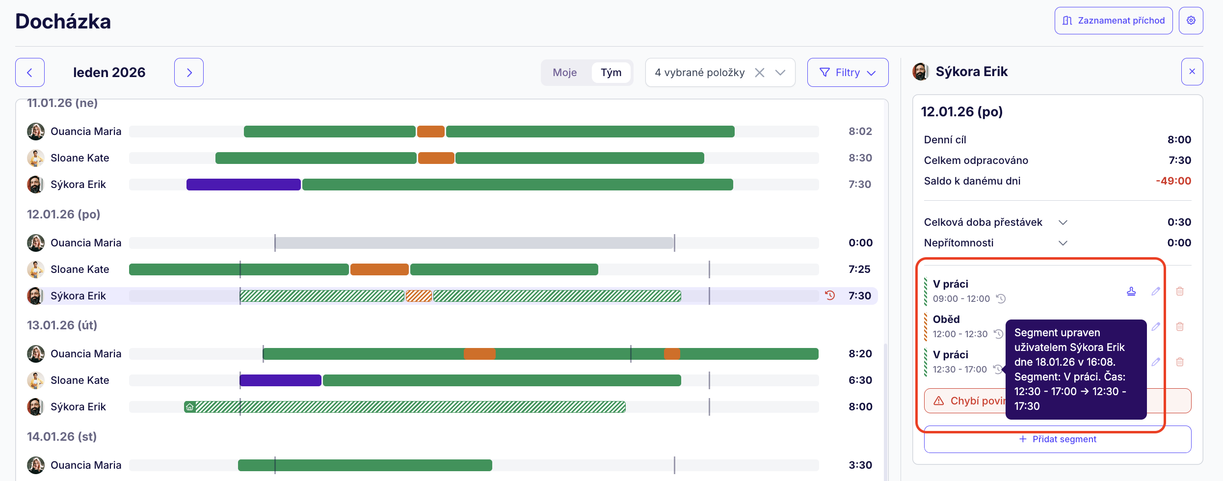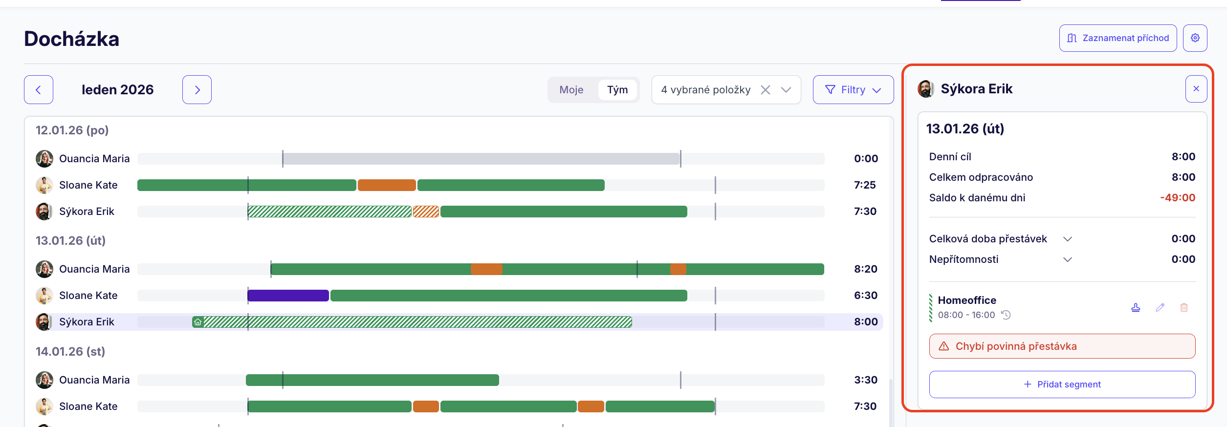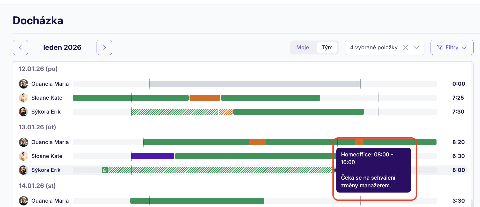 V sekci 'Tým' zobrazíte docházku ostatních uživatelů. Jako manažer týmu si zde můžete celý tým nebo pouze vybrané uživatele.