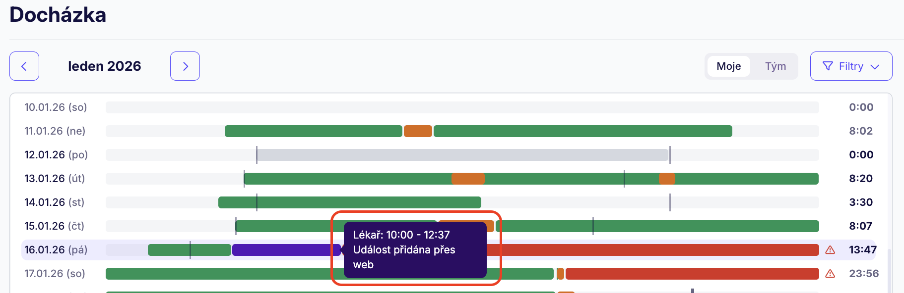 Dashboard docházky vám nabízí barevný přehled všech událostí za daný měsíc s rozpadem na každý den. Stačí najet na jednotlivý den a barvu a zobrazíte si, o jakou událost se jedná a v jakém časovém rozmezí proběhla.