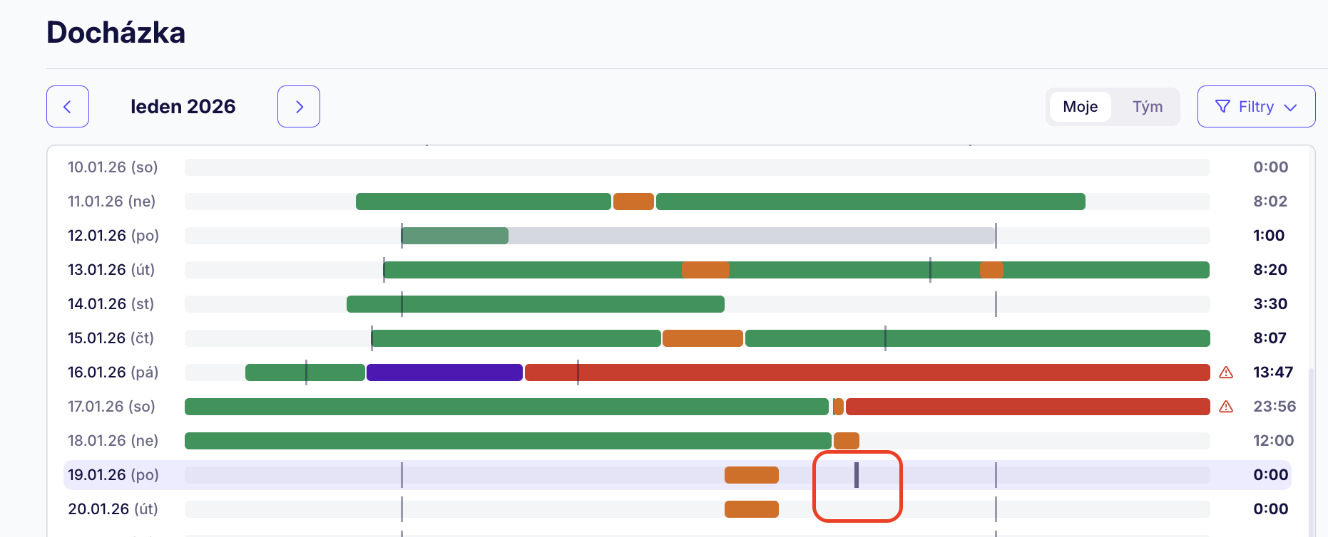Znak vykřičníku vám napoví, že se v docházce nachází nějaká nesrovnalost nebo netypický segment, například neukončená směna.