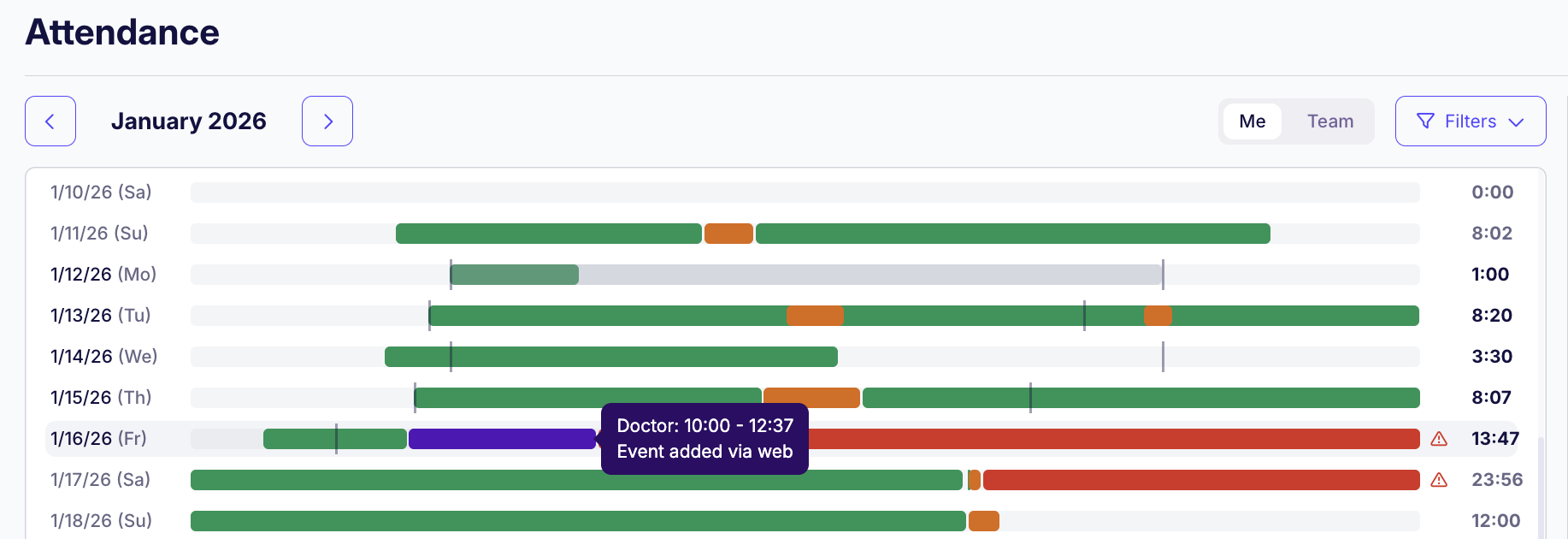 The attendance dashboard provides a color-coded overview of all events for the selected month, broken down by individual days. Simply hover over a specific day and color to see what type of event it represents and the time range during which it occurred.