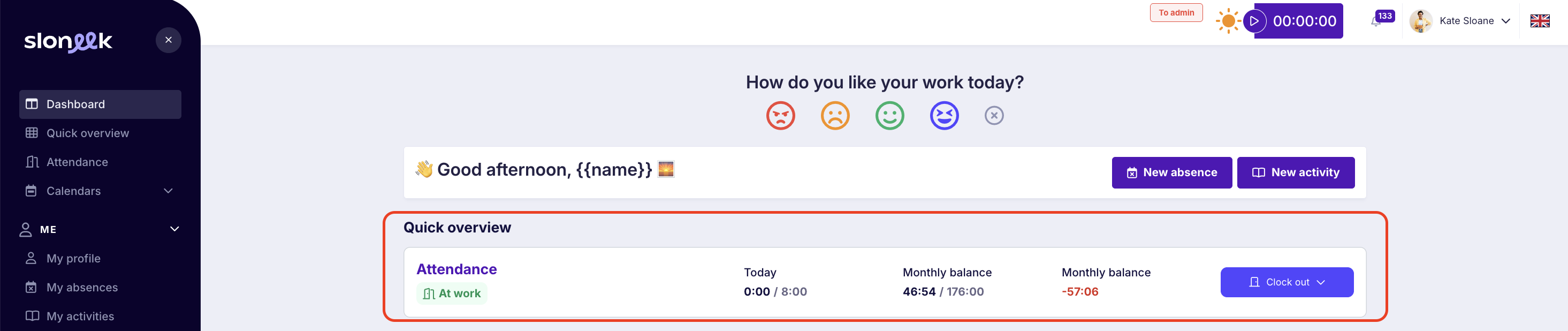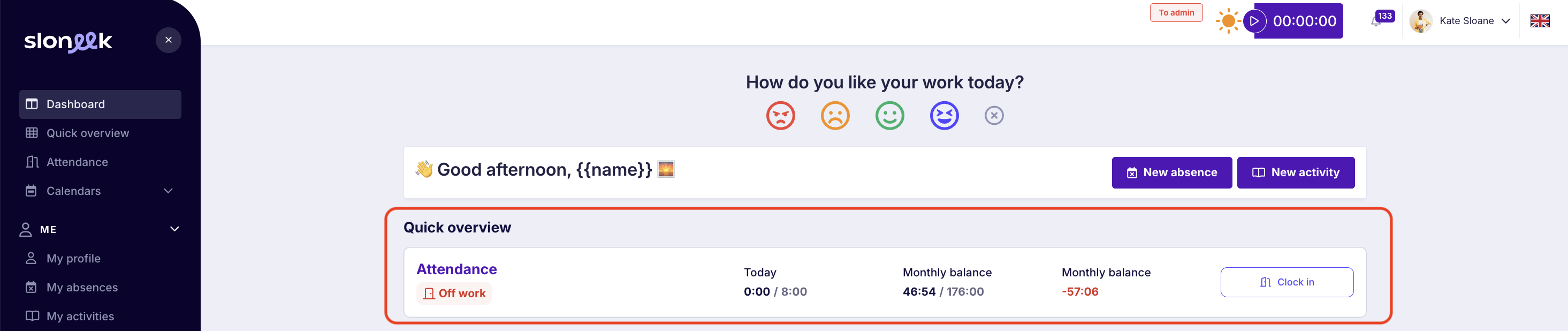 Via the Sloneek web interface by clicking 'Clock-in' on the main dashboard. You will follow the same process when recording a break or clocking out of work.